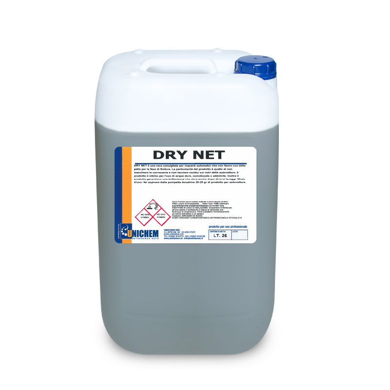 DRY NET è una cera consigliata per impianti automatici che non fanno uso della pelle per la fase di finitura. La particolarità del prodotto è quello di non macchiare le carrozzerie e non lasciare residui sui vetri delle autovetture. Il prodotto è ottimo per l’uso di acque dure, osmotizzate o addolcite. Inoltre il prodotto garantisce una brillantezza che dura anche dopo diversi lavaggi. Modo d’uso: far aspirare dalla pompetta dosatrice 20-25 gr di prodotto per autovettura.