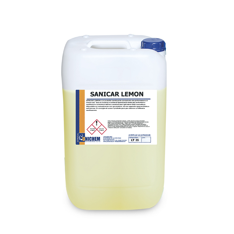 SANICAR LEMON è un prodotto sanatizzante concentrato alla profumazione di limone con base di essenze e sostanze igienizzanti ideale per profumare e sanificare le condutture dell’aria condizionata e gli interni delle autovetture. Utilizzabile sia manualmente con spruzzatore, sia con apposita apparecchiatura self-service. Si consiglia di usare il prodotto puro per ottenere un’efficacia sanificazione.